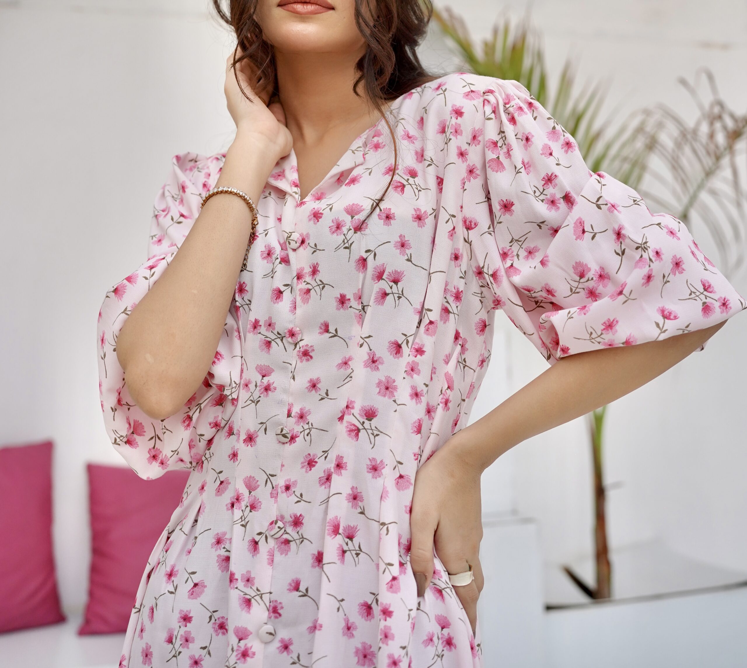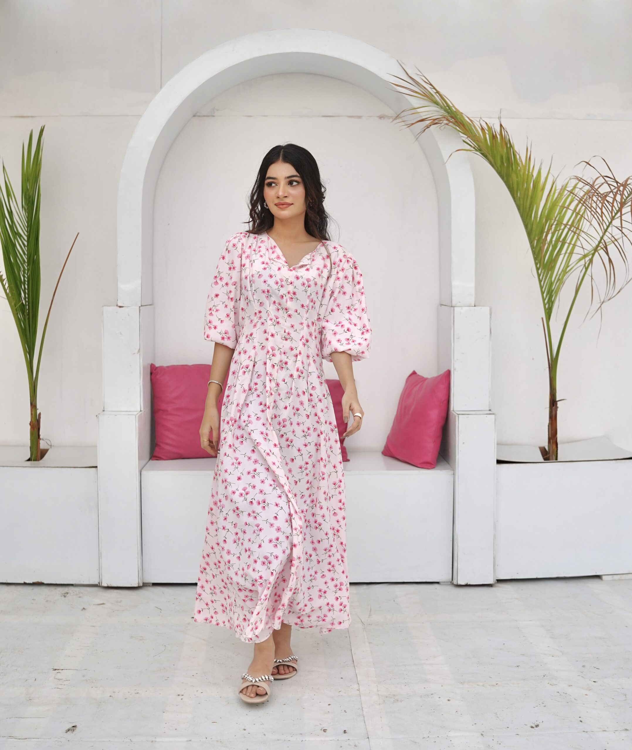 A mesmerizing long floral dress crafted from delicate crepe fabric, elegantly blends shades of white and soft pink. The dress embodies a sense of timeless beauty and feminine allure.